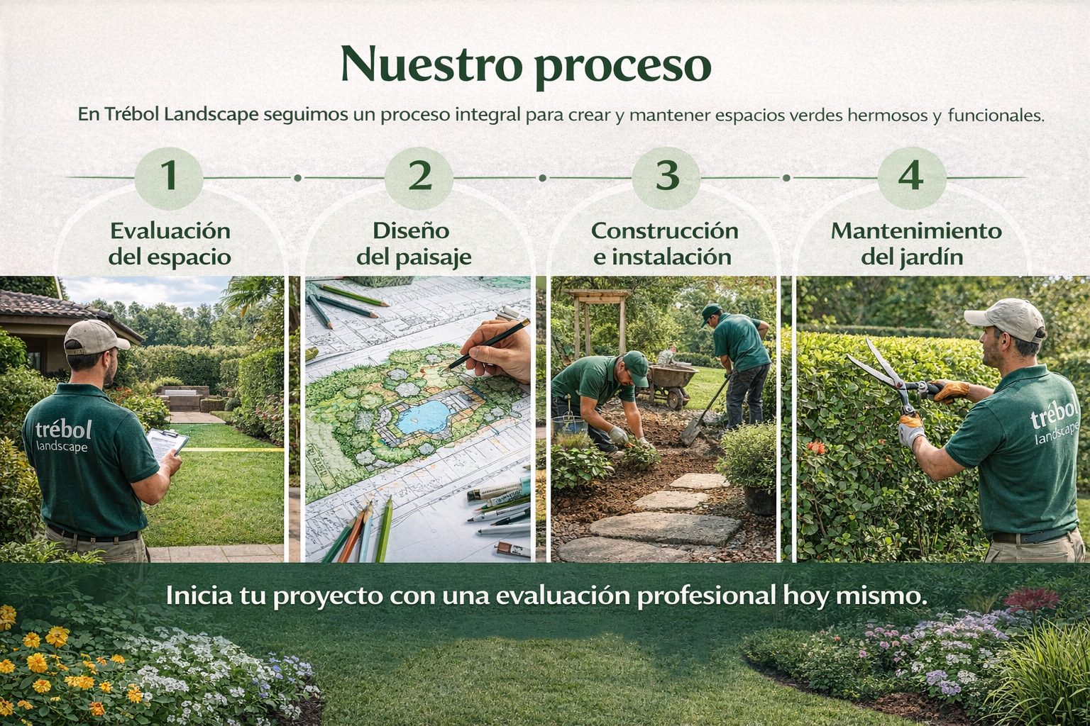 En Trébol Landscape trabajamos bajo un proceso integral que garantiza resultados funcionales, estéticos y duraderos. Cada proyecto inicia con un análisis detallado del espacio, seguido de un diseño estratégico que responde a las necesidades del entorno y del cliente. Posteriormente, llevamos a cabo la construcción e instalación con altos estándares de calidad, y finalmente aseguramos el mantenimiento adecuado para preservar la salud y belleza del jardín a lo largo del tiempo. Nuestro enfoque nos permite acompañarte en cada etapa, desde la idea inicial hasta la consolidación de tu espacio verde.
